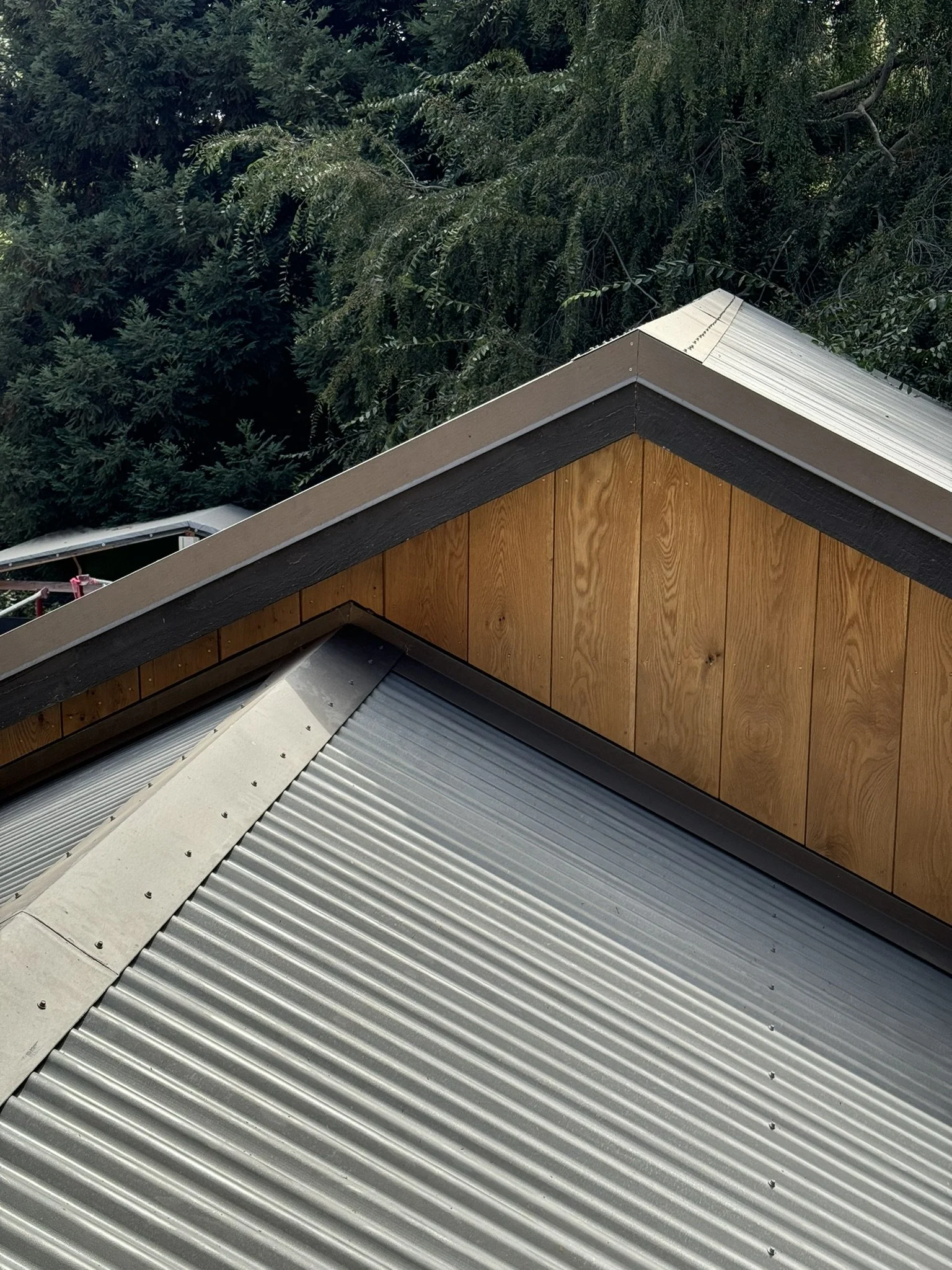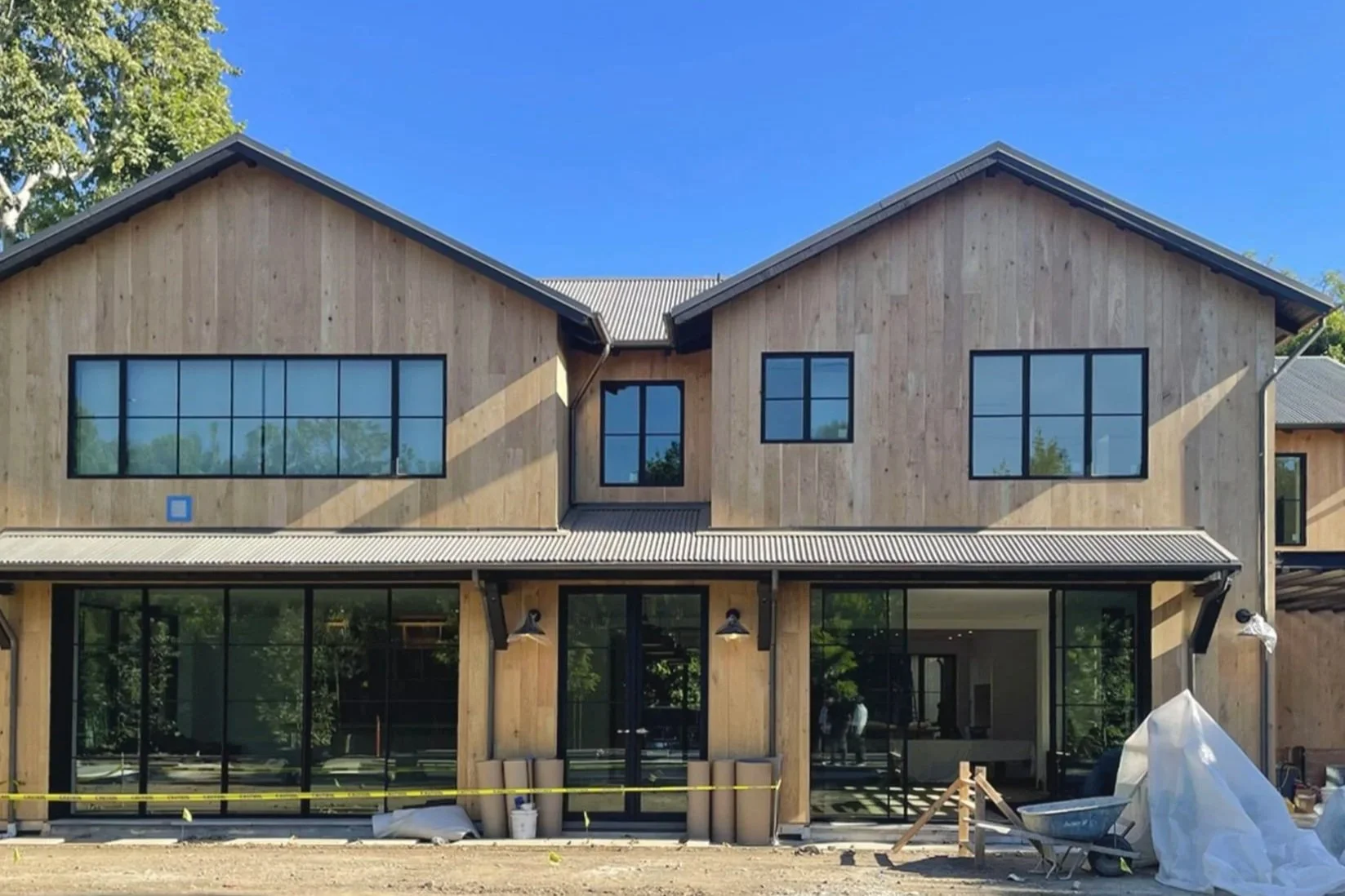 This modern farmhouse in Mandeville Canyon, Brentwood, blends rustic charm with contemporary design. Featuring warm wood siding, large black-framed windows, and a sleek corrugated metal roof, the home offers a balance of traditional and modern elements. The spacious layout emphasizes indoor-outdoor living, with wide oak floors and custom cabinetry enhancing the interior’s organic, refined feel.This project was designed by Tim Barber Architects, where we contributed to its development as part of the Architecture team. It is currently under construction.